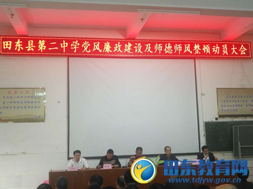 3月23日下午,县纪委驻教育局纪检组、局监察室到田东二中召开师德师风整顿大会。会议组织学习《监察法》、《教师法》条款,通报我县教育系统违反党风廉政建设、违反师德师风建设案例,提出整改意见。